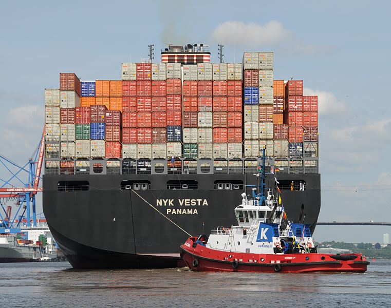 Hamburger Hafen. Die NYK VESTA hat eine Breite von 45,60m und eine Länge