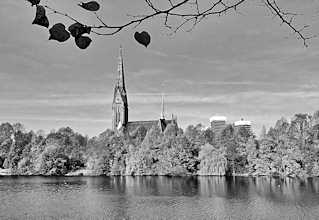 7373 Blick über den Kuhmühlenteich zur St. Gertrud-Kirche in Hamburg Uhlenhorst.