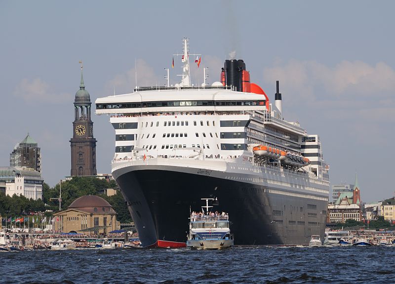 Michaeliskirche. Die R.M.S. (Royal Mail Ship) Queen Mary 2 (QM2) ist mit 148.528 BRZ eines der größten Passagierschiff